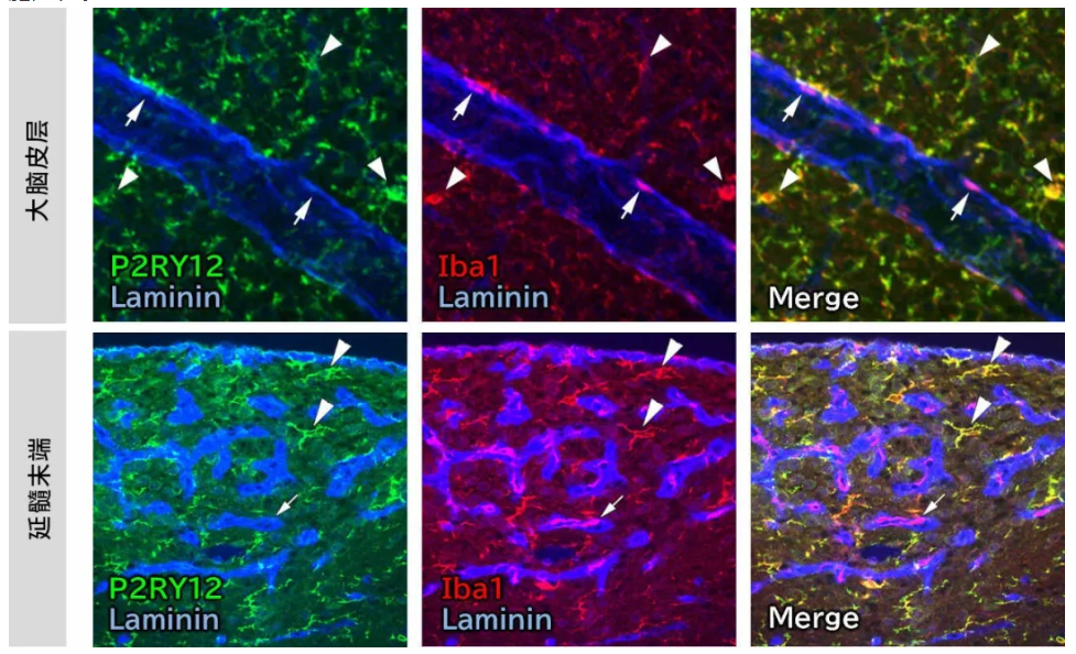 P2RY12(也称为P2Y12)是一种腺苷5'-二磷酸(ADP)受体,也是嘌呤能G蛋白偶联受体P2Y家族的成员。它在外周组织的血小板中表达,也在中枢神经系统的稳态小胶质细胞(Homeostatic Microglia)中特异性表达。由于P2RY12几乎不在巨噬细胞中表达,所以它是用于区分存在脑血管周围的巨噬细胞和小胶质细胞的有效标志物1)。此外,ADP可用作细胞损伤的信号,小胶质细胞中的P2RY12被认为在接收神经细胞损伤方面发挥作用。