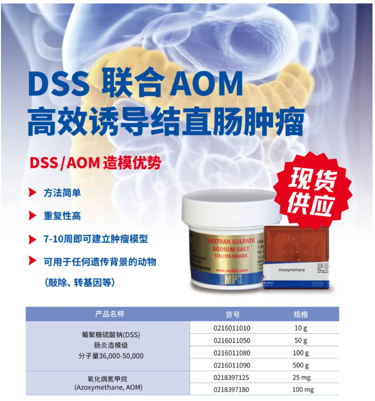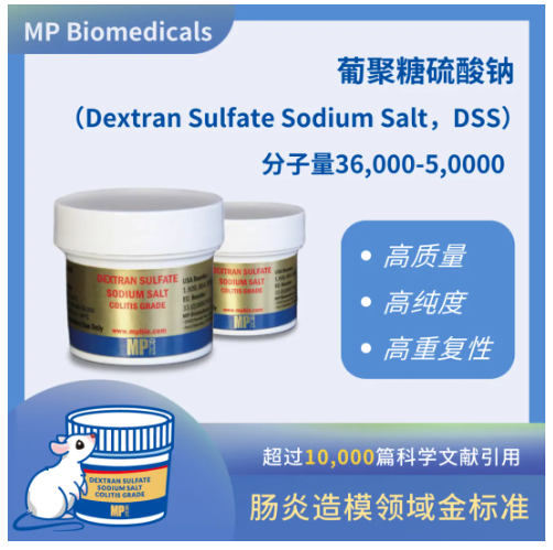 葡聚糖硫酸钠(Dextran Sulfate Sodium Salt,DSS) 是一种聚阴离子衍生物,常用于诱导建立动物溃疡性结肠炎模型,是目前肠炎造模研究领域金标准。MP Biomedicals 生产的DSS具有高质量、高纯度、高重复性的特点。迄今为止,有超过10,000篇科学文献引用,有效性得到了业界广泛认可。