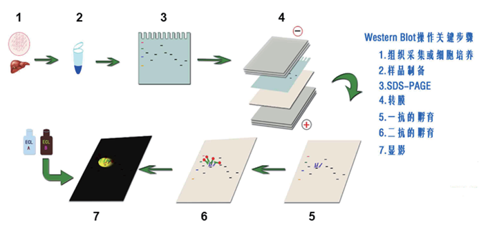 免疫印迹(Immunoblotting)又称蛋白质印迹(Western Blot,WB),是一种综合性的免疫学检测技术。它利用SDS-PAGE技术将生物样品中的蛋白质分子按分子量的大小在凝胶上分离开,然后用电转移的方法将蛋白转移到固相膜上,以固相膜上的蛋白质作为抗原,与对应的抗体起免疫反应,再与酶标记的第二抗体起反应,经过底物显色或荧光成像等方法以检测电泳分离的特异性目的基因表达的蛋白质。WB技术现已广泛应用于蛋白水平的表达研究、抗体活性检测和疾病早期诊断等多个研究领域。