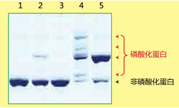 Phos-tag™ SDS-PAGE 操作简单,只需在常规 SDS-PAGE 胶中加入 Phos-tag™ Acrylamide 和 Mn2+ 或者 Zn2+ 即可进行实验。在电泳过程中,磷酸化蛋白的磷酸基团与 Phos-tag™ 中的二价金属离子相结合,降低其迁移速度,从而可区分磷酸化与非磷酸化蛋白。