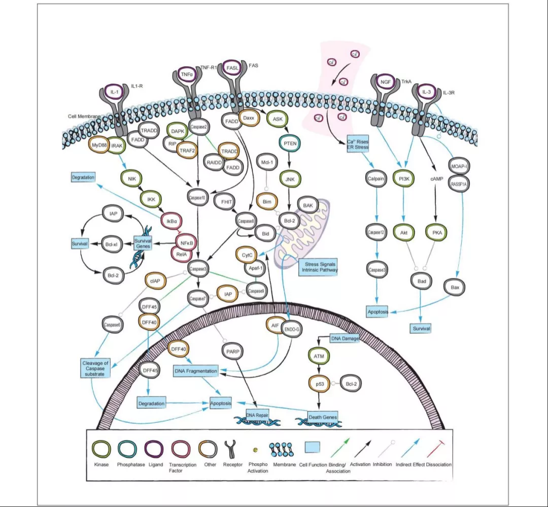 细胞凋亡(Apoptosis),又称程序性细胞死亡(Programmed Cell Death),是指为维持内环境稳定,由基因控制的细胞自主的有序性死亡,它涉及一系列的基因的激活、表达以及调控等作用。