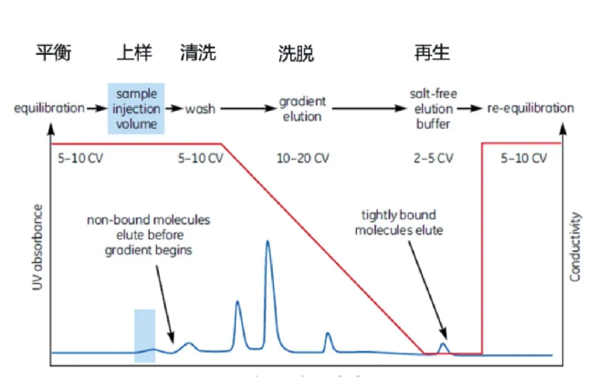 离子交换层析是基于蛋白质和离子交换层析介质之间的电荷相互作用进行分离。离子交换层析介质通常带有正或负电荷,吸附带有相反电荷的蛋白质。通过调整缓冲液的离子浓度或pH值,可以改变蛋白质与介质的结合强度,实现不同蛋白质的分离。