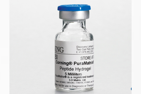 Corning® PuraMatrix™ Peptide Hydrogel is a synthetic matrix used to create defined three dimensional (3D) micro-environments for a variety of cell culture experiments. To achieve optimal cell growth and differentiation, it is necessary to determine the appropriate mixture of this material and bioactive molecules (e.g., growth factors, extracellular matrix (ECM) proteins, and/or other molecules). Corning PuraMatrix Peptide Hydrogel consists of standard amino acids (1% w/v) and 99% water. Under physiological conditions, the peptide component self-assembles into a 3D hydrogel with a nanometer-scale fibrous structure. The hydrogel is readily formed in a Falcon culture dish, plate, or cell culture insert.